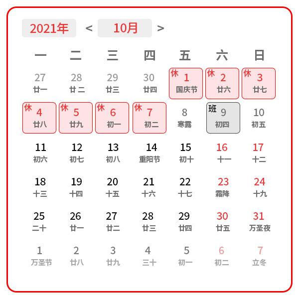 2021年国庆节放假通知(休:2021.10.1~2021.10.7)