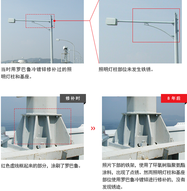 大鸣门桥连接着淡路岛和四国,由于常年经受着海风的侵袭,需要定期保养。大桥建成后的10年、也就是1995年,大鸣门桥的照明灯柱进行了修补。桥面两旁的照明灯柱原来是热镀锌的,但是经过多年的使用,原来的镀锌层已腐蚀耗尽出现了点锈。照明灯柱的基座、照明灯的接口等部位用罗巴鲁冷镀锌涂料进行了修补。至今8年过去,还未发现有锈迹。